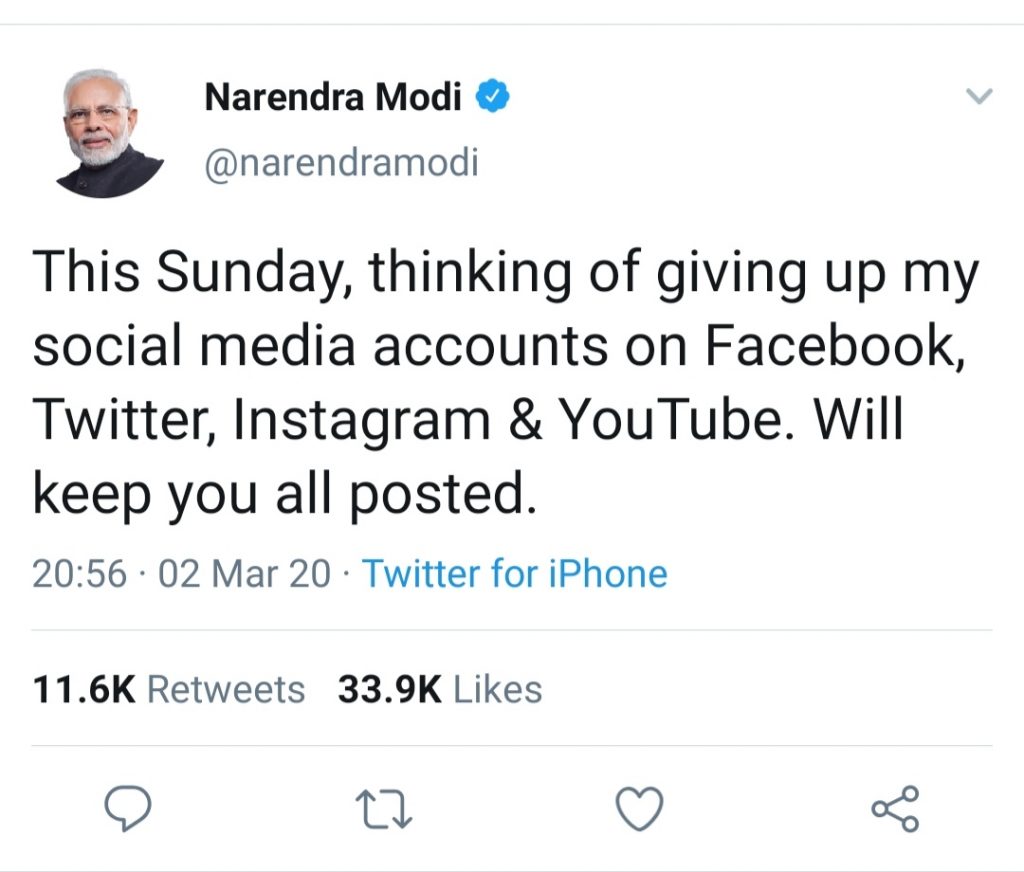 सोशल मीडिया छोड़ सकते हैं प्रधानमंत्री नरेंद्र मोदी