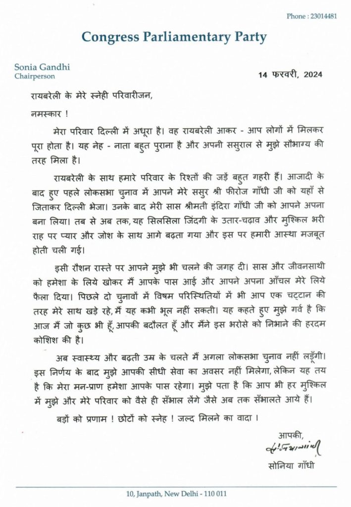 कांग्रेस की पूर्व राष्ट्रीय अध्यक्ष सोनिया गांधी ने राजस्थान से राज्यसभा का नामांकन करने के बाद रायबरेली वासियों के नाम चिट्ठी लिखी है. जो काफी भावुक करने वाली है. इसमें उन्होंने कहा है कि अब वे लोकसभा चुनाव नहीं लड़ेंगी, लेकिन उनके मन और प्राण हमेशा रायबरेली के पास ही रहेंगे.
